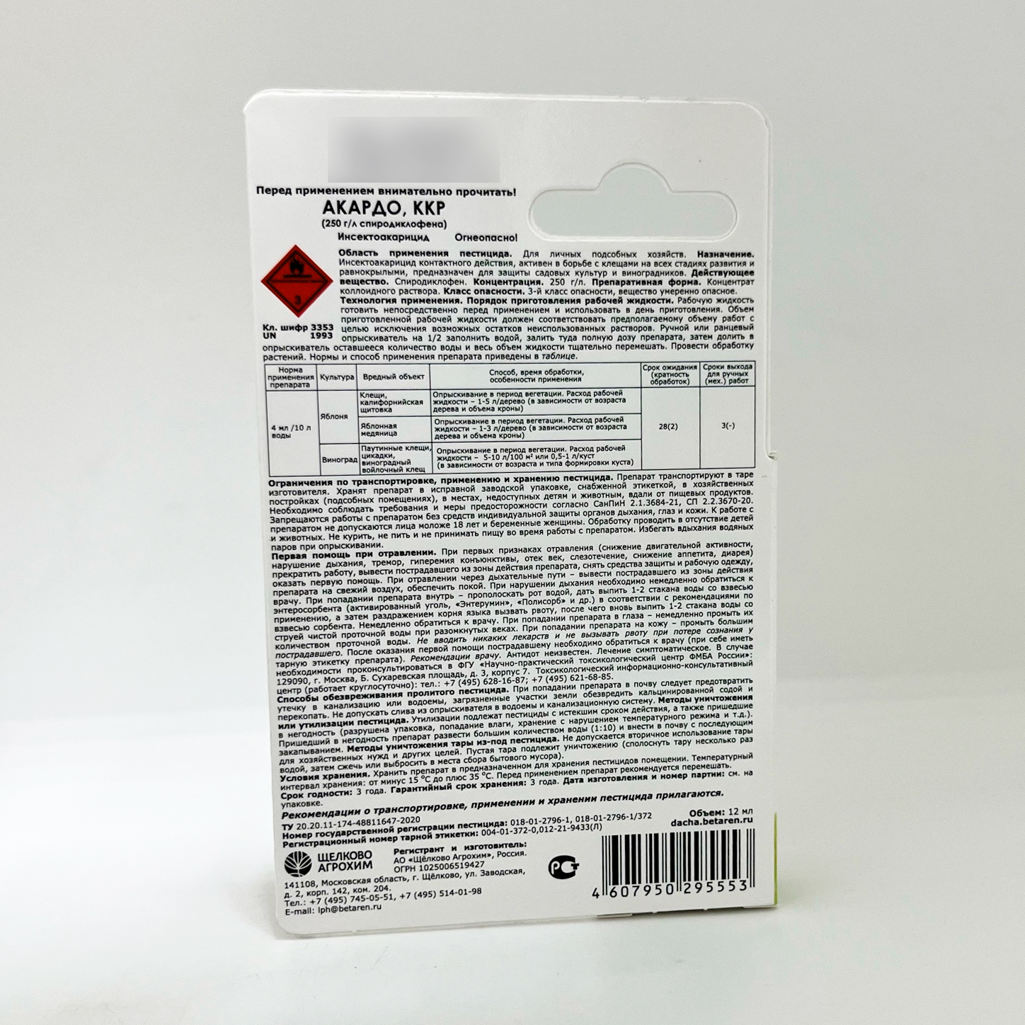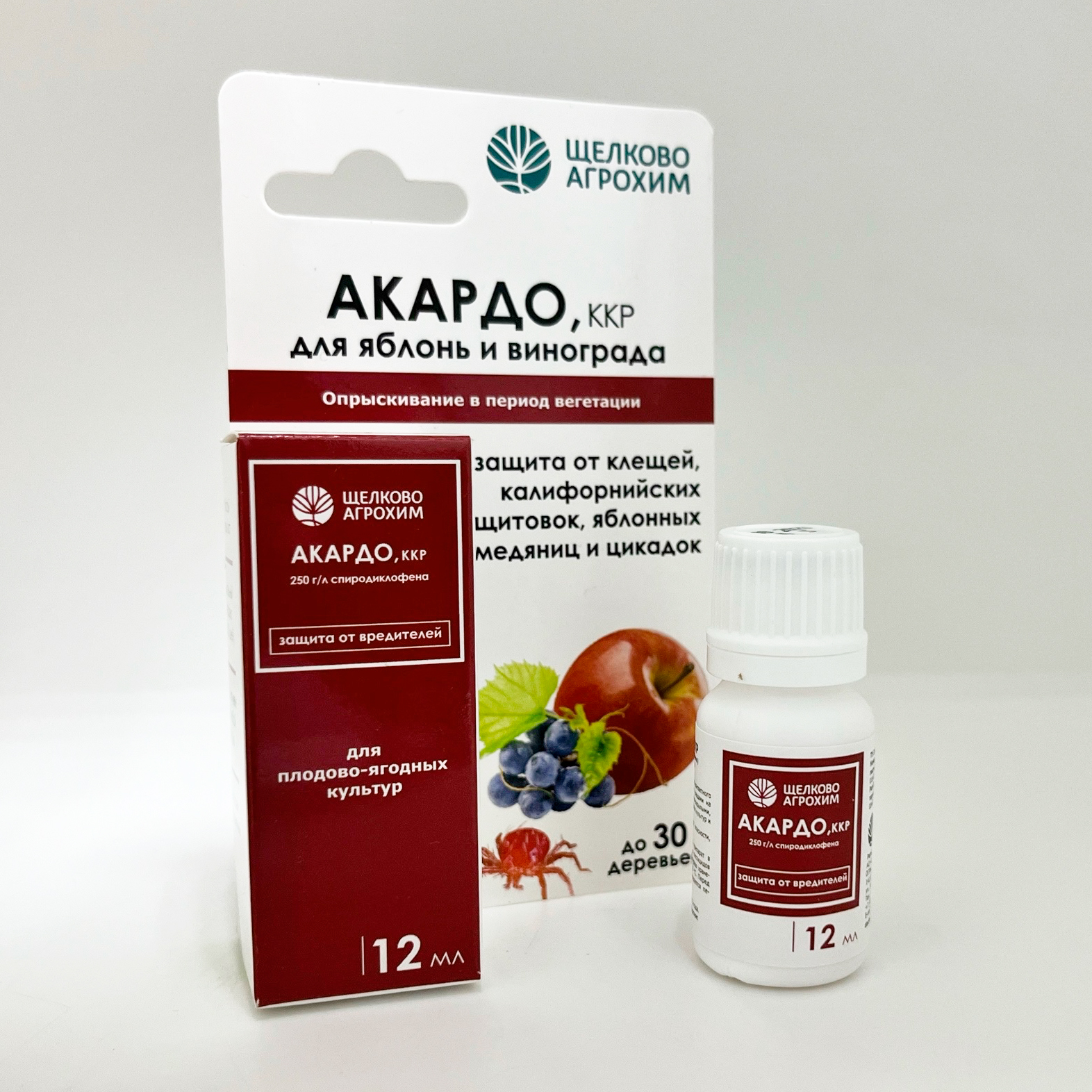 Акардо, ККР, 12мл от клещей для яблонь и виноградаКонтактный инсектоакарицид нового химического класса для борьбы с клещами и другими вредителями на яблоне и винограде. Препарат оказывает активное воздействие на устойчивые к традиционным акарицидам популяции. Быстрое действие и высокая эффективность при любых погодных условиях.