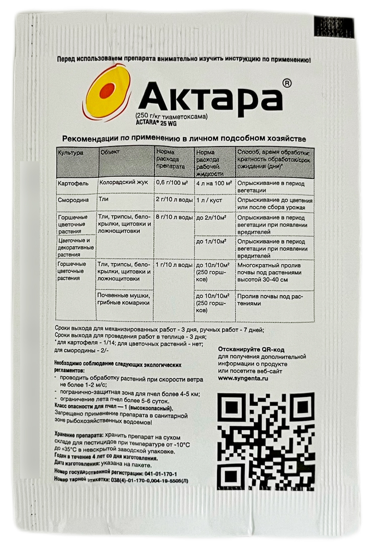 АКТАРА® — эффективный системный инсектицид, быстро действует (от 15 до 60 минут) независимо от погоды.АКТАРА® гарантированно защищает растения в течение 14-21 дня, на 6-7 дней дольше, чем другие инсектициды, защищает и молодые побеги, которые появились после обработки, благодаря высокой растворимости. Действующее вещество двигается по растению только вверх по ксилеме и не накапливается в клубнях, овощах и плодах, которые формируются из пластических масс по флоэме. Обладает эффектом повышения жизненной силы растения.