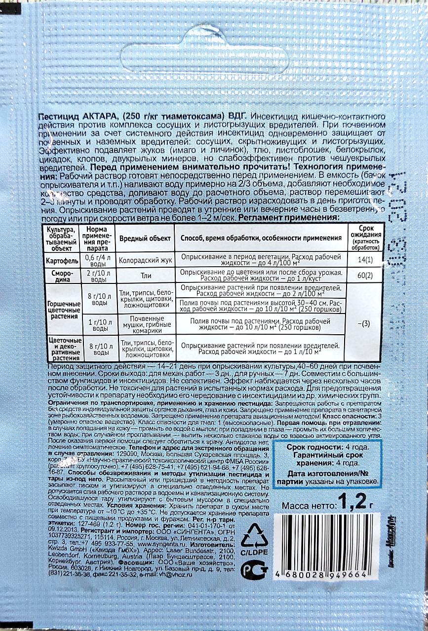 Актара порошок 1,2г инсектицид из ЕвропыСостав: 250 г/кг тиаметоксама ВДГ (воднодиспергируемые гранулы).