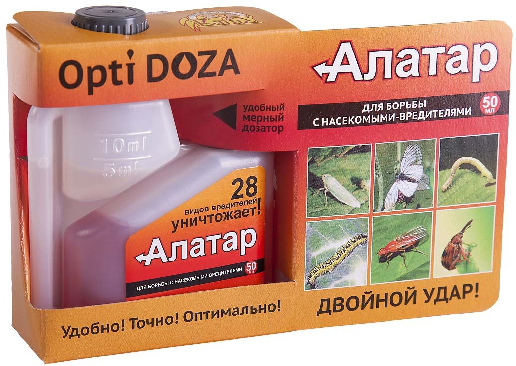 Содержит: КЭ, 50г/л циперметрина + 225г/л малатиона «Алатар» - универсальный препарат для защиты большинства садово-огородных культур от целого ряда вредителей. Норма расхода: 5мл/10л воды. Алатар: уничтожает 29 видов садовых и огородных вредителей! При выборе препарата для защиты сада и огорода обратите внимание на новинку - препарат «Алатар». Это универсальный препарат, он эффективен против множества вредителей (плодожорок, белянок, совок, листоверток, тлей, колорадского жука, медяницы, трипсов, белокрылок, долгоносиков, клещей и т.д. ). «Алатар» защитит от вредителей большинство садовых и огородных культур на Вашем участке (капусту, огурцы, томаты, яблоню, смородину, малину, цветы и т.д.) «Алатар» наносит по вредителям двойной удар, так как содержит сразу два действующих вещества: малатион и циперметрин. Он успешно подавляет даже устойчивые популяции вредителей и обладает синергическим эффектом. Входящий в его состав прилипатель препятствует скатыванию раствора с листьев и смыванию дождем, удлиняет периодХарактеристики