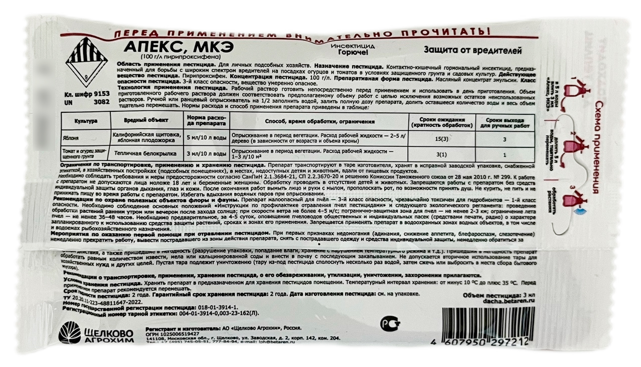Инсектицид для защиты плодовых и овощных культур Апекс, ампула 3млПрепарат «Апекс, МКЭ» на основе пирипроксифена обладает контактно-кишечным действием и влияет на физиологические процессы насекомых для защиты от вредителей в ТЕПЛИЦАХ.