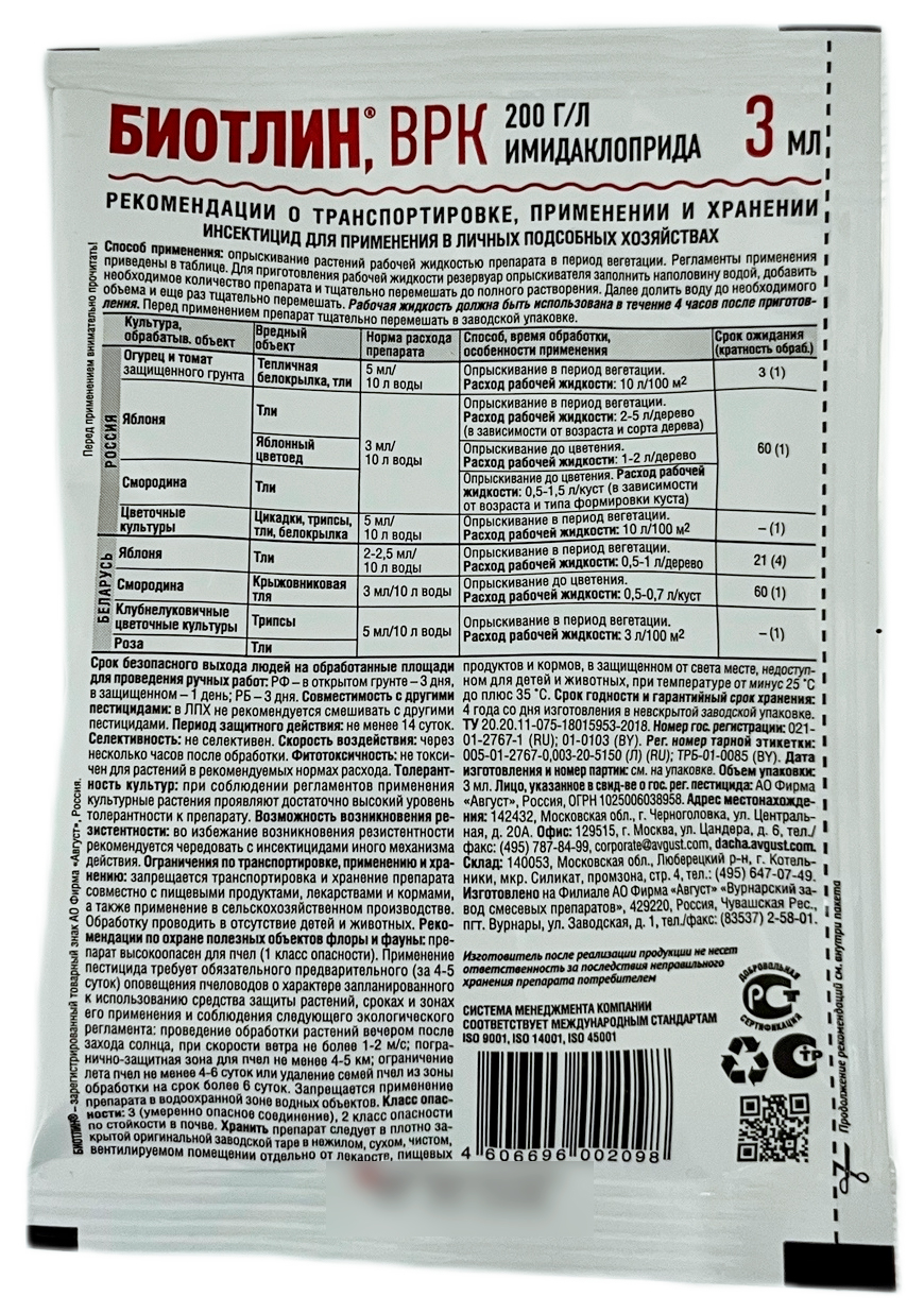 Инсектицид БИОТЛИН Avgust 3млНовейший системный препарат против тли, а также других сосущих вредителей: белокрылки, яблонного цветоеда, цикадок, трипсов на огурцах, томатах и цветах, яблоне и смородине.