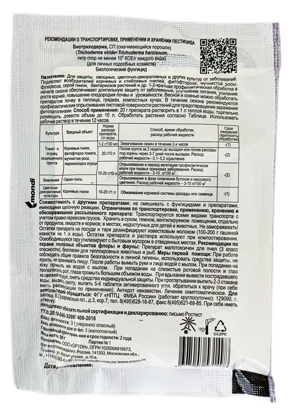 Состав: trichoderma viride, титр не менее 109 КОЕ/г и Trichoderma harzianum, титр не менее 109 КОЕ/г.