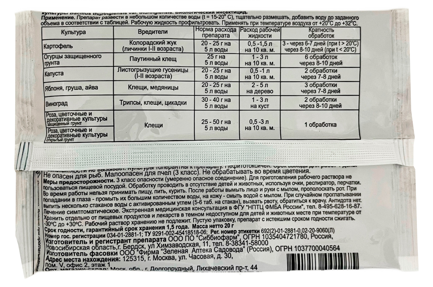 Битоксибациллин 20грИнсектицид кишечного действия для защиты растений от сосущих, листогрызущих и плодоповреждающих вредителей. Применяется на овощных, ягодных, плодовых и декоративных культурах. Препарат гарантирует получение экологически чистой, безопасной для здоровья продукции, может применяться в любую фазу развития растений, действует избирательно в отношении широкого спектра вредителей, не накапливается в плодах.