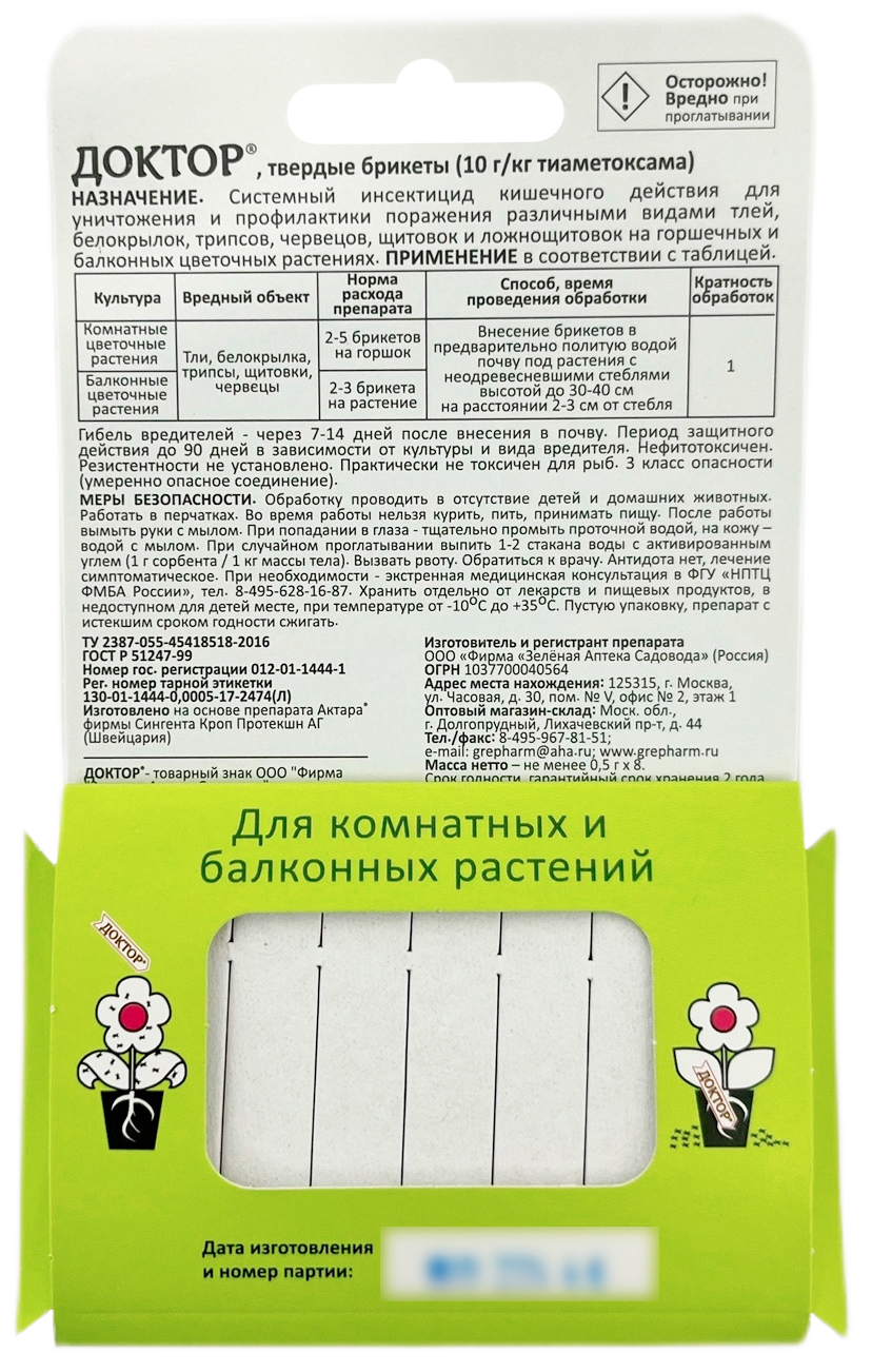 Доктор 8 стрел (актара)Средство от вредителей «Доктор» — препарат системного действия для эффективной борьбы с вредителями комнатных и балконных растений. Уничтожает таких насекомых как тля, червец, белокрылка, щитовка, трипс.