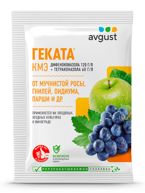 Геката - комбинированный препарат от комплекса болезней на плодовых, ягодных культурах и винограде. Инфекции сада, гнили портят плоды, сокращают срок хранения, снижают урожайность и могут даже привести к гибели растения. Зараженные яблоки и груши выделяют токсины, вредные для человека. Геката содержит уникальное сочетание действующих веществ, что позволяет эффективно лечить и защищать от болезней, не вызывая привыкания у возбудителей инфекции.От парши и мучнистой росы первое опрыскивание, профилактическое, проводят в стадии "зеленый конус", когда из почки только показался зеленый кончик листа. Препарат обладает системными свойствами - равномерно распределяется внутри ткани растения, защищая в дальнейшем молодую поросль. Необходимо провести 3 обработки с интервалом 7-14 дней.