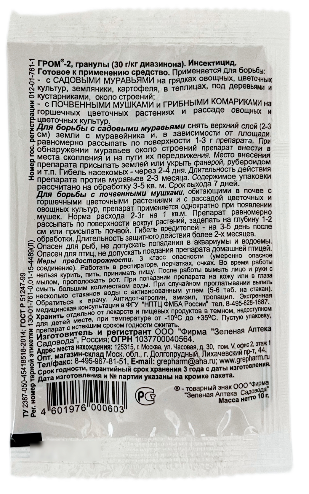 Гром-2 от муравьев 10гВысокоэффективное средство для борьбы с садовыми муравьями на грядках, в теплице, газонах, и цветниках. Обладает высокой контактно-кишечной активностью. Не оказывает отрицательного влияния на почвенные микроорганизмы и дождевых червей. Применяется в малых нормах расхода: 1 мл достаточно для обработки около 5 - 10 муравейников.