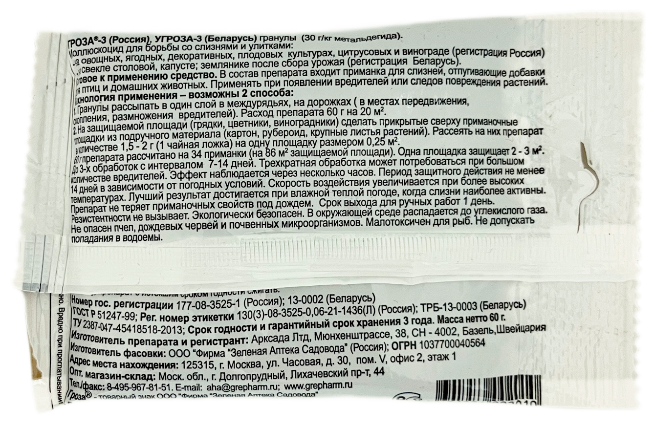 Средство от слизней, улиток Гроза-3 60гДля борьбы с улитками и слизнями. На овощных, ягодных, декоративных культурах, винограде. Препарат можно использовать двумя способами: