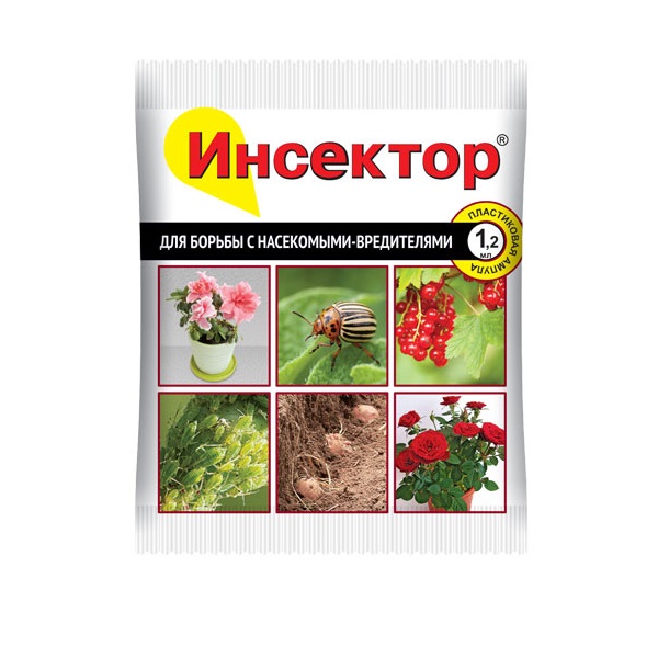Для защиты от сосущих (тли, цикадки, белокрылка), грызущих (колорадский жук (и его личинки), пьявица, блошки) насекомых. 1,2 мл препарата достаточно для обработки 2 соток! Эффект наблюдается через несколько часов после обработки. На данный момент не отмечается резистентности к колорадскому жуку. «Инсектор» выпускается в Щвейцарии, а фасовка его осуществляется в России.Характеристики