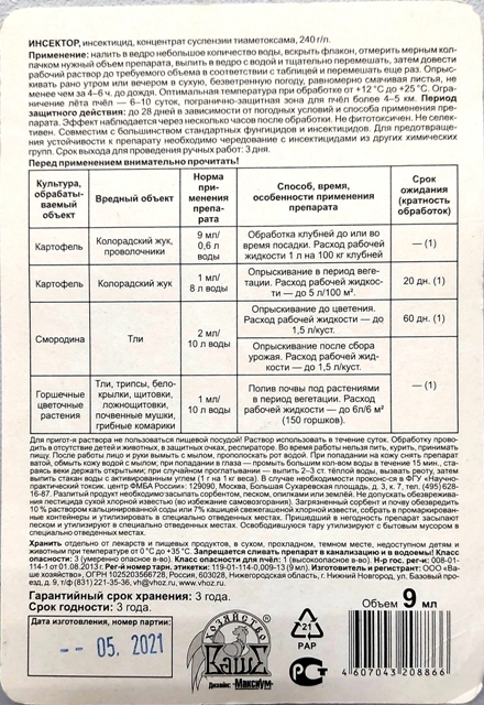 Инсектор флакон 9млИнсектицид для опрыскивания растений, широкого спектра действия, активен в борьбе с жесткокрылыми, равнокрылыми, чешуекрылыми, клопами, пьявницами и другими насекомыми на картофеле, смородине и цветочных культурах. Период защитного действия до 28 дней в зависимости от погодных условий и способа применения препарата. Эффект наблюдается через несколько часов после обработки. Не фитотоксичен.