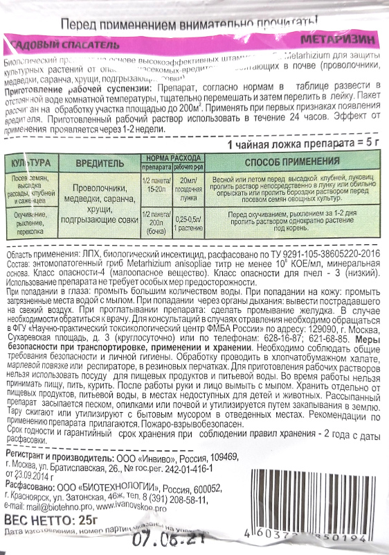- Препараты на основе грибов Metarhizium имеют ограниченный срок хранения, при покупке следует на это обращать внимание.