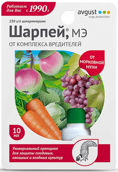 Шарпей – инсектицид контактно-кишечного действия для борьбы с широким спектром вредителей на овощных, плодовых культурах и винограде.Шарпей обладает быстрым действием, поражает нервную систему вредных насекомых. В течение 10 - 15 минут после обработки они перестают передвигаться, а затем за 1,5 - 2 ч гибнут в результате общего паралича всех органов. В зависимости от вида вредителя, стадии его развития и погодных условий период защитного действия составляет от 7 до 14 дней. Таким образом, в течение 2 недель ваши растения защищены от насекомых, которые могут отродиться из яйцекладок, переместиться с соседних участков или с ваших необработанных культур.