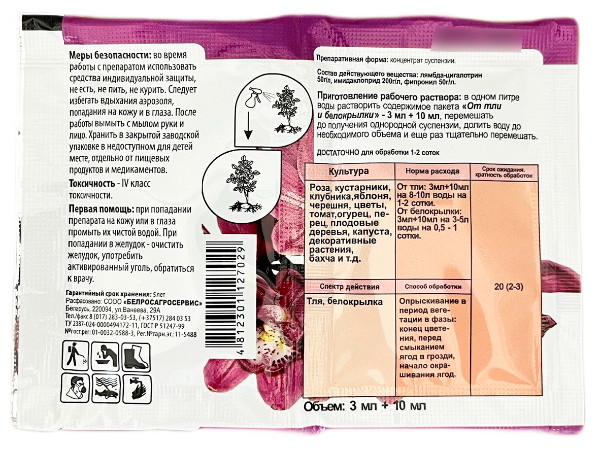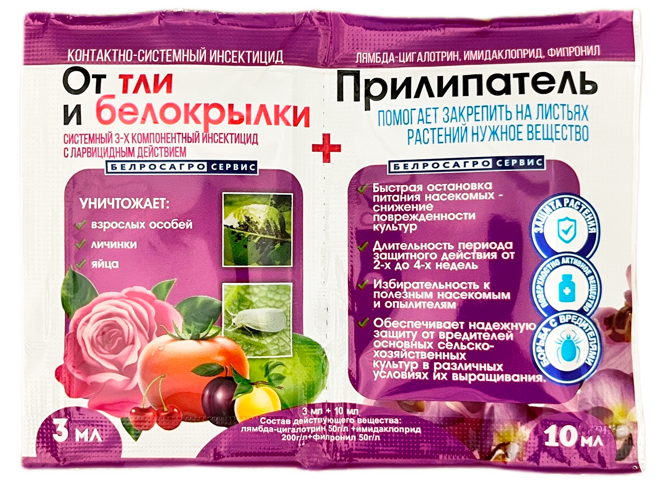Контактно-системный инсектицид от тли и белокрылки 3мл + прилепатель 10мл.Помогает закрепить на листьях растений нужное вещество.