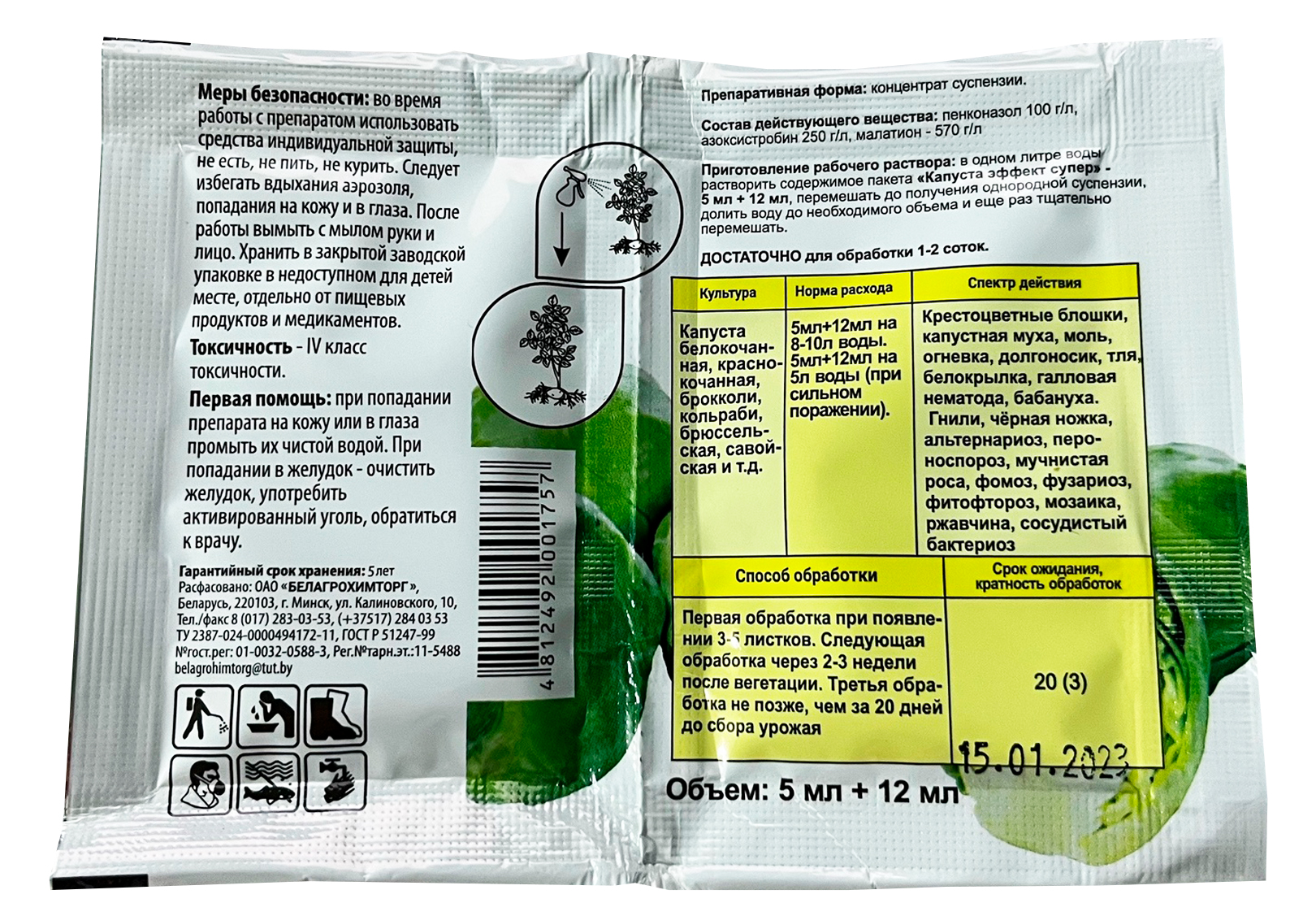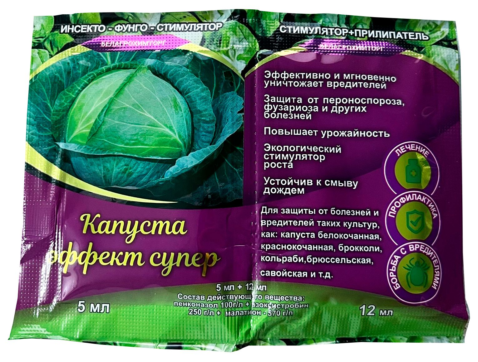 Спасатель 5мл + 12мл инсекто - фунго - стимулятор капусты. Для защиты от болезней и вредителей таких культур, как: капуста белокочанная, краснокочанная, брокколи, кольраби, брюссельская, савойская и т.д.Состав: пенконазол 100 г/л + азоксистробин 250 г/л, малатион 570 г/л.