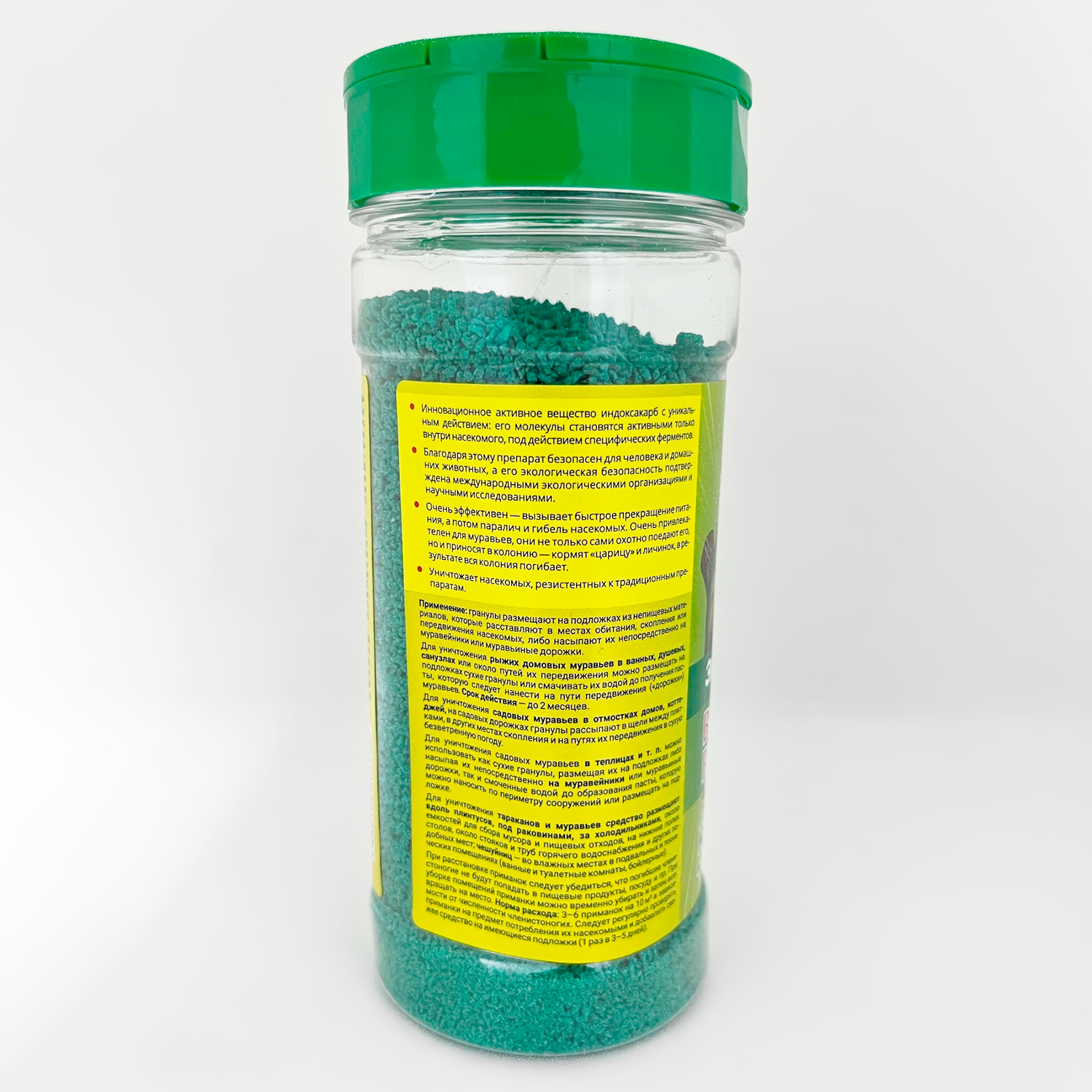 Очень эффективен — вызывает быстрое прекращение питания, а потом паралич и гибель насекомых. Очень привлекателен для муравьев, они не только сами охотно поедают его, но и приносят в колонию — кормят «царицу» и личинок, в результате вся колония погибает.