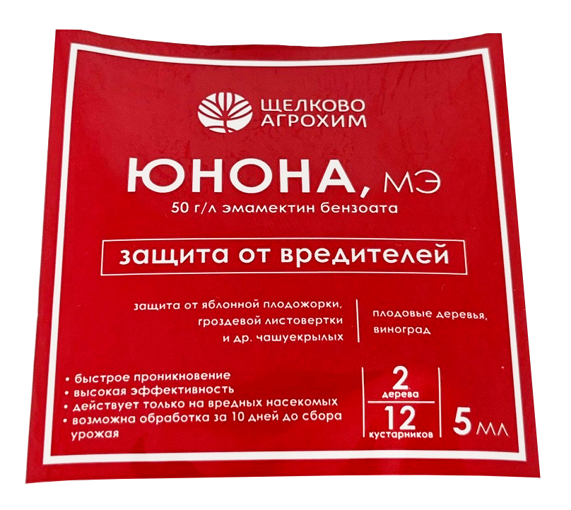 Щелково Агрохим Юнона – инсектицид контактно-кишечного действия для защиты садов и виноградников от чешуекрылых вредителей. Действующее вещество – 50 г/л эмамектина бензоата. Препарат обладает высокой эффективностью инсектицида за счёт инновационной формуляции – микроэмульсии. Инсектицид быстро проникает и равномерно распределяет препарат внутри листа, имеет повышенную трансламинарную активность и короткий период ожидания. Вещество воздействует на два участка центральной нервной системы насекомого: связывает рецепторы γ-аминомасляной кислоты в синапсе и h-рецепторы в мышечных клетках. Это приводит к расслаблению мышц (они не могут сокращаться), через 1-4 часа гусеницы перестают питаться и насекомое в течении 1-4 суток погибает. Защитное действие продолжается 10-15 суток.• Инсектицид обладает высокой избирательностью, действует только на чешуекрылых.