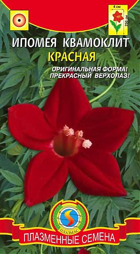 Прекрасная вьющаяся лиана, сочетающая в себе кружевную, интересно выглядящую листву и выглядывающие сквозь неё красные звездочки цветков, и привлекающая в Ваш сад большое количество разноцветных бабочек. Растение быстро вырастает до высоты 2-3 метров, создавая густую массу мягко-зелёной листвы. Листья до 9см длиной, линейно рассеченные на 9-19 пар линейных долей, за счёт этого лист выглядит как птичье перо. Яркие звездообразные трубчатые цветки, 3-4см в диаметре, расположены над листвой. Растение цветёт всё лето и начало осени, до первых заморозков. В саду Ипомея квамоклит прекрасно подойдёт для создания плотной теневой завесы в летнее время, или для быстрого прикрытия непривлекательно выглядящих стен, оград и т.д. При обеспечении опор, может выращиваться в горшках, или отдельной группой при создании бордюра.ПОСЕВ: в грунт на постоянное место в мае, или в торфо-перегнойные горшочки в марте - апреле - на рассаду. Перед посевом семена необходимо замачивать в теплой воде в течение суток. Глубина задел