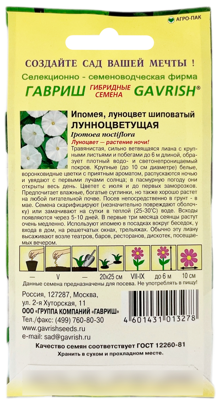 Ипомея луноцвет шиповатый ЛУННОЦВЕТУЩАЯ ГАВРИШТравянистая, сильно ветвящаяся лиана с крупными листьями и побегами до 6 м длиной, образует плотный водо- и светонепроницаемый покров. Ценится благодаря эффектным, с приятным ароматом, крупным (до 10 см) белым цветкам, которые расцветают ночью и увядают с первыми лучами солнца; в пасмурную погоду они открыты весь день. Цветет с июля и до первых заморозков.