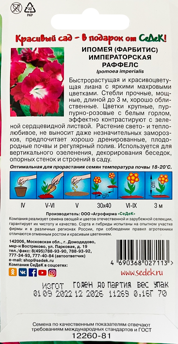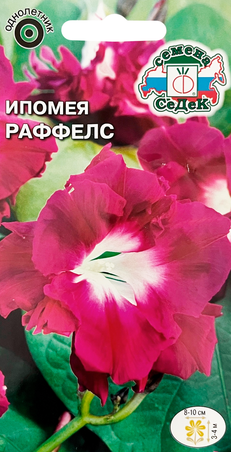 Ипомея РаффелсБыстрорастущая и красивоцветущая лиана с яркими махровыми цветками. Стебли прочные, мощные, длиной до 3 м, хорошо облиственные. Цветки крупные, пурпурно розовые с белым горлом, эффектно контрастируют с зеленой сердцевидной листвой. Растение свето- и теплолюбивое, не выносит даже незначительных заморозков, предпочитает хорошо дренированные, плодородные почвы и регулярный полив. Используется для вертикального озеленения, декорирования беседок, опорных стенок и строений в саду.