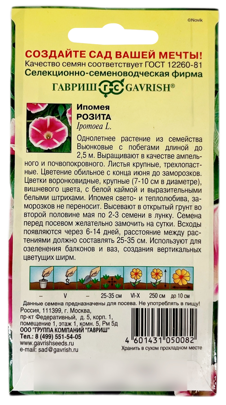 Ипомея РОЗИТА ГАВРИШВьющееся однолетнее растение для вертикального озеленения из семейства Вьюнковые, с побегами, длиной до 2,5 м. Листья крупные, сердцевидные. Цветение обильное - с конца июня до заморозков. Цветки воронковидные, крупные (7-10 см в диаметре), вишневого с белой каймой и выразительными белыми штрихами. Ипомея светолюбива и теплолюбива, заморозков не переносит. Высевают в открытый грунт во второй половине мая по 2-3 семени в лунку. Семена перед посевом желательно замачивать на сутки. Всходы появляются через 6-14 дней, расстояние между растениями должно составлять 25-35 см. Используется для озеленения балконов и ваз, создания вертикальных цветущих ширм.
