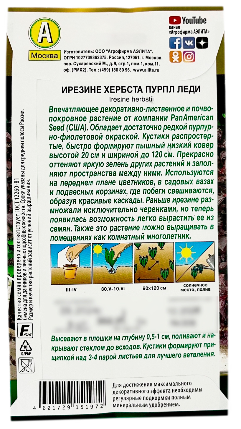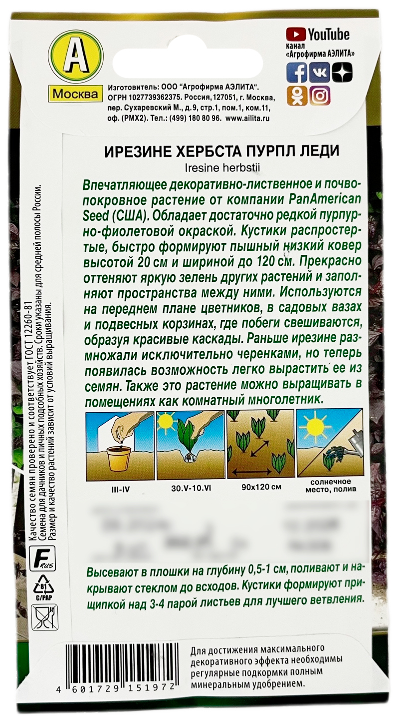Ирезине ХЕРБСТА ПУРПЛ ЛЕДИ АЭЛИТАОбладает достаточно редкой пурпурно-фиолетовой окраской. Кустики распростертые, быстро формируют пышный низкий ковер высотой 20 см и шириной до 120 см. Прекрасно оттеняют яркую зелень других растений и заполняют пространства между ними. Используются на переднем плане цветников, в садовых вазах и подвесных корзинах, где побеги свешиваются, образуя красивые каскады. Раньше ирезине размножали исключительно черенками, но теперь появилась возможность легко вырастить ее из семян. Также это растение можно выращивать в помещениях как комнатный многолетник.