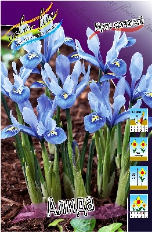 Ирис Алида относится к сетчатым сортам. Цветок голубой с синим центром, желтым мазком и желтыми штрихами. Диаметр цветка 6-8 см. Высота растения 20 см. Посадка растения в сентябре-октябре на глубину 10-15 см. Цветение ириса в мае – июне. Предпочитают легкие, богатые питательными веществами почвы с нейтральной или слабокислой реакцией. Ирис любит солнце и безветренные, тихие места, зимостоек. Используется в мужских композициях и букетах. Ирисы можно использовать для выгонки.Характеристики