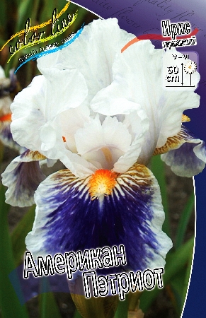 Ирис Американ Пэтриот – корневищное растение высотой 90см. Мечевидные листья с восковым налетом собраны в вееровидные пучки. Цветки оригинальной расцветки с белыми верхними лепестками и фиолетово-синими с белой каймой нижними, размером 12-14см, источают сладковатый тонкий аромат. Цветет с июня по июль. Используется для всех типов ландшафтного дизайна (украшение клумб, бордюров, рабаток). Прекрасно смотрится в срезке.Наибольшей декоративности ирис достигает на открытых солнечных, защищенных от ветра участках. Предпочитает хорошо окультуренные, средние по механическому составу почвы, с нейтральной или слабокислой реакцией.