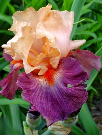 Высота 70-80 см. Цветок красочный, верхние лепестки бледно - палево - розовые, нижние - фиолетовые с красной бородкой.Характеристики
