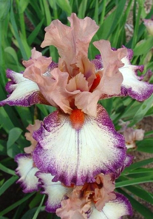 Ирис Германский Морнинг Моод верх персиково-розоватый с темно-сиреневыми штрихами, низ белый с фиолетовой каймой, бородка оранжевая, Н-90смХарактеристики