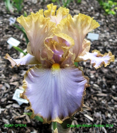 Верх - палево-нежно-розоватый с желтой каймой, низ - палево-голубой с желтой каймой, бородка желтая. Разбор: I. Упаковка в п/эт. пакет + полноцветная картинка.Характеристики