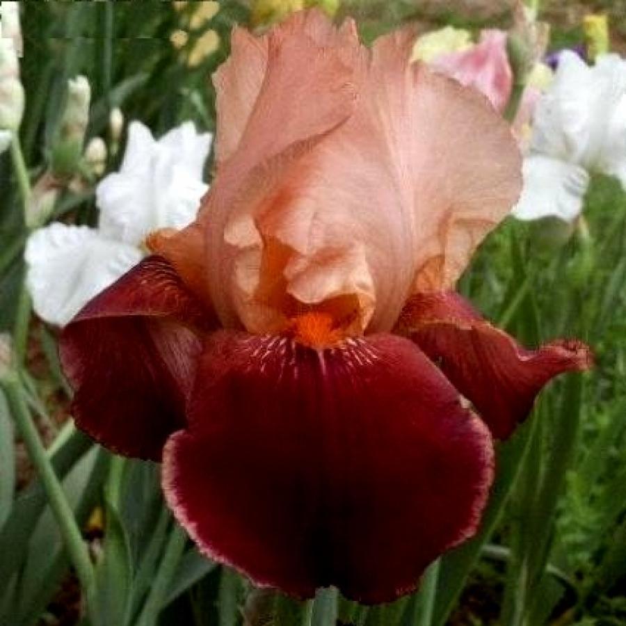 Ирис бородатый: высота растений 70-80 см, цветки оригинальной формы, на прочном разветвленном цветоносе. На наружных долях околоцветника бородка из густых волосков. Листья мечевидные, с восковым налетом собраны в вееровидные пучки. Цветение июнь-июль.Циммарон Стрип: верхние лепестки оранжево-янтарные и бордово-фиолетовые нижние. Высота растения до 75 см.