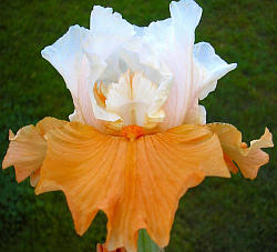 Верхние лепестки сливочно-белые, нижние лепестки желтовато-оранжевые, бородка мандариновая.