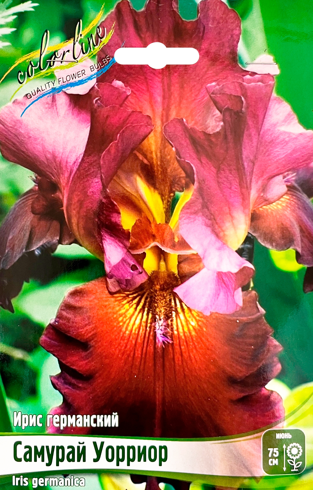 Ирис Самурай УорриорОтносится к германским сортам. Цветок малиново-красный с небольшой жёлтой сеточкой. Высота растения 75 см. Посадка растения проводится: осенью в сентябре-октябре, весной в апреле-мае, а также летом, после цветения растения. При посадке, корневище слегка углубляется и мульчируется по поверхности. Цветение ириса происходит в мае - июне.