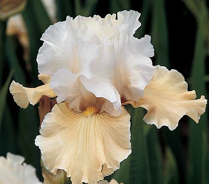 Ирис бородатый "Шампань Элеганс" - многолетний, крупноцветковый сорт. Высота ириса около 90 сантиметров. Период посадки: в конце апреля - в первой половине мая. Период цветения: июнь, возможно повторное цветение в сентябре. Цветок крупного размера, верхние лепестки белого цвета, нижние лососево-абрикосового оттенка, края лепестков сильно гофрированные. Для посадки выбирают солнечные места, лёгкие суглинистые почвы с нейтральной реакцией. Полив умеренный 1-2 раза в неделю, растение не переносит избыточного увлажнения. Осенью проводят обрезку листьев, на высоте 10-15 сантиметров от земли. На зиму растение укрывают лапником или укрывным материалом.Характеристики
