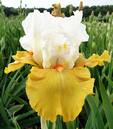 Ирис бородатый Yes Верх- белый, низ- медово-желтый с небольшой бронзовой сеточкой у центра, бородка оранжевая.Описание Ирис бородатый Yes Яркий контраст и великолепные формы. Гофрированный. Аромат нежный, приятный. Период цветения июгь-июль. Высота растения до 90 см.