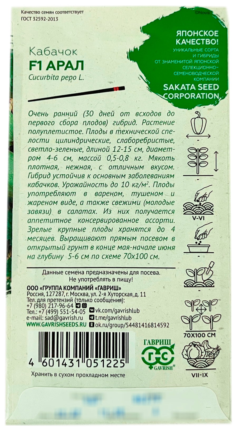 Кабачок АРАЛ F1 ГАВРИШОчень ранний (30 дней от всходов до первого сбора плодов) гибрид. Растение полуплетистое. Плоды в технической спелости цилиндрические, слаборебристые, светло-зеленые, длиной 12-15 см, диаметром 4-6 см, массой 0,5-0,8 кг. Мякоть плотная, нежная, с отличным вкусом. Гибрид устойчив к основным заболеваниям кабачков. Урожайность до 10 кг/м². Плоды употребляют в вареном, тушеном и жареном виде, а также свежими (молодые завязи) в салатах. Из них получается аппетитное консервированное ассорти. Зрелые крупные плоды хранятся до 4 месяцев.