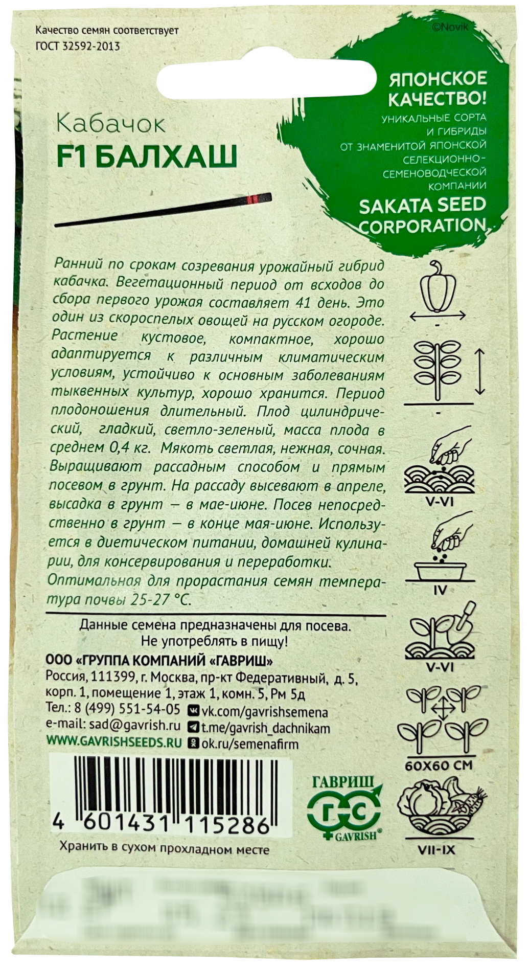 Кабачок Балхаш F1 ГАВРИШРанний по срокам созревания урожайный гибрид кабачка. Вегетационный период от всходов до сбора первого урожая составляет 41 день. Это один из скороспелых овощей на русском огороде. Растение кустовое, компактное, хорошо адаптируется к различным климатическим условиям, устойчиво к основным заболеваниям тыквенных культур, хорошо хранится. Период плодоношения длительный. Плод цилиндрический, гладкий, светло-зеленый, масса плода в среднем 0,4 кг. Мякоть светлая, нежная, сочная. Выращивают рассадным способом и прямым посевом в грунт. На рассаду высевают в апреле, высадка в грунт — в мае-июне. Посев непосредственно в грунт в конце мая-июне. Используется в диетическом питании, в домашней кулинарии, для консервирования и переработки.