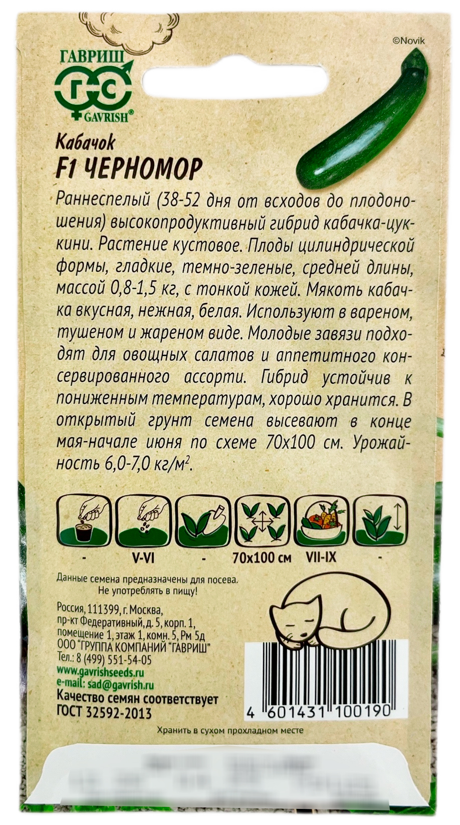 Кабачок Черномор F1 ГАВРИШРаннеспелый (38-52 дня от всходов до плодоношения) высокопродуктивный гибрид кабачка цуккини. Растение кустовое. Плоды цилиндрической формы, гладкие, темно-зеленые, средней длины, массой 0,8-1,5 кг, с тонкой кожей. Мякоть кабачка вкусная, нежная, белая. Используют в вареном, тушеном и жареном виде. Молодые завязи подходят для овощных салатов и аппетитных консервированных ассорти. Гибрид устойчив к пониженным температурам, хорошо хранится. В открытый грунт семена высевают в конце мая-начале июня по схеме 70х100 см. Урожайность 6,0-7,0 кг/м.