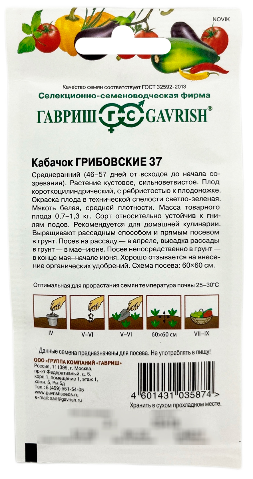 Кабачок Грибовские 37Среднеранний (46-57 дней от всходов до начала созревания). Выращивается рассадным способом и прямым посевом в грунт. Посев на рассаду - в апреле, высадка рассады в грунт - в мае – июне. Посев непосредственно в грунт в конце мая – июне. Хорошо отзывается на внесение органических удобрений. Растение кустовое, сильноветвящееся. Плод короткоцилиндрический с ребристостью к плодоножке. Окраска плода в технической спелости светло-зеленая. Мякоть белая, средней плотности. Масса товарного плода 0,7-1,3 кг. Вкусовые качества хорошие. Урожайность до 9,0 кг/кв.м. Схема посева: 60х60 см. Относительно устойчив к гнилям плодов. Рекомендуется для домашней кулинарии.