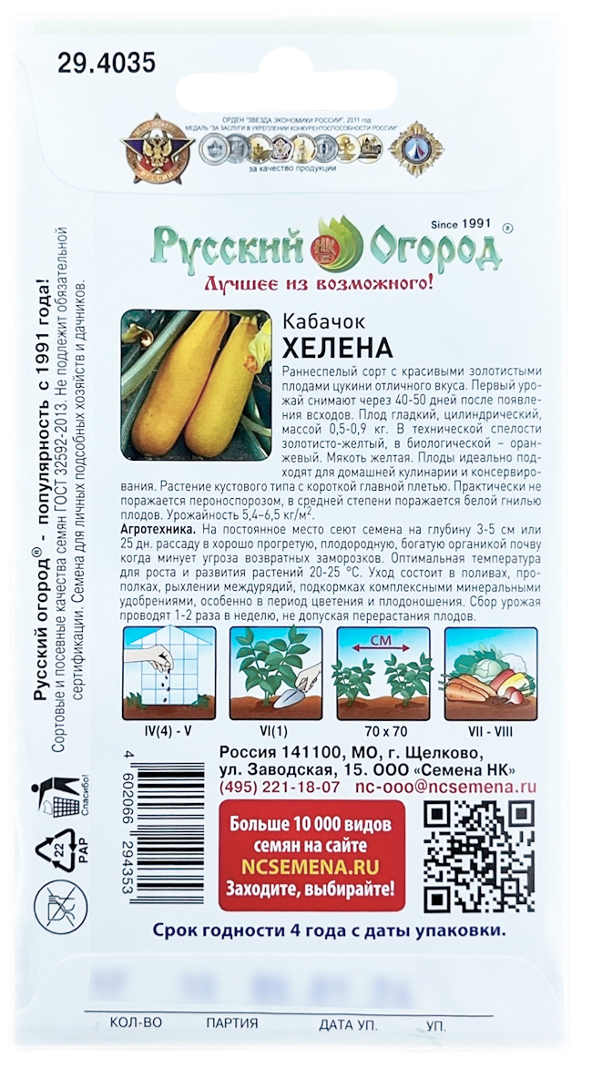 Кабачок ХЕЛЕНА Русский ОгородРаннеспелый сорт с красивыми золотистыми плодами цукини отличного вкуса. Первый урожай снимают через 40-50 дней после появления всходов. Плод гладкий, цилиндрический, массой 0,5-0,9 кг. В технической спелости золотисто-желтый, в биологической – оранжевый. Мякоть желтая. Плоды идеально подходят для домашней кулинарии и консервирования. Растение кустового типа с короткой главной плетью. Практически не поражается пероноспорозом, в средней степени поражается белой гнилью плодов. Урожайность 5,4–6,5 кг/м2.