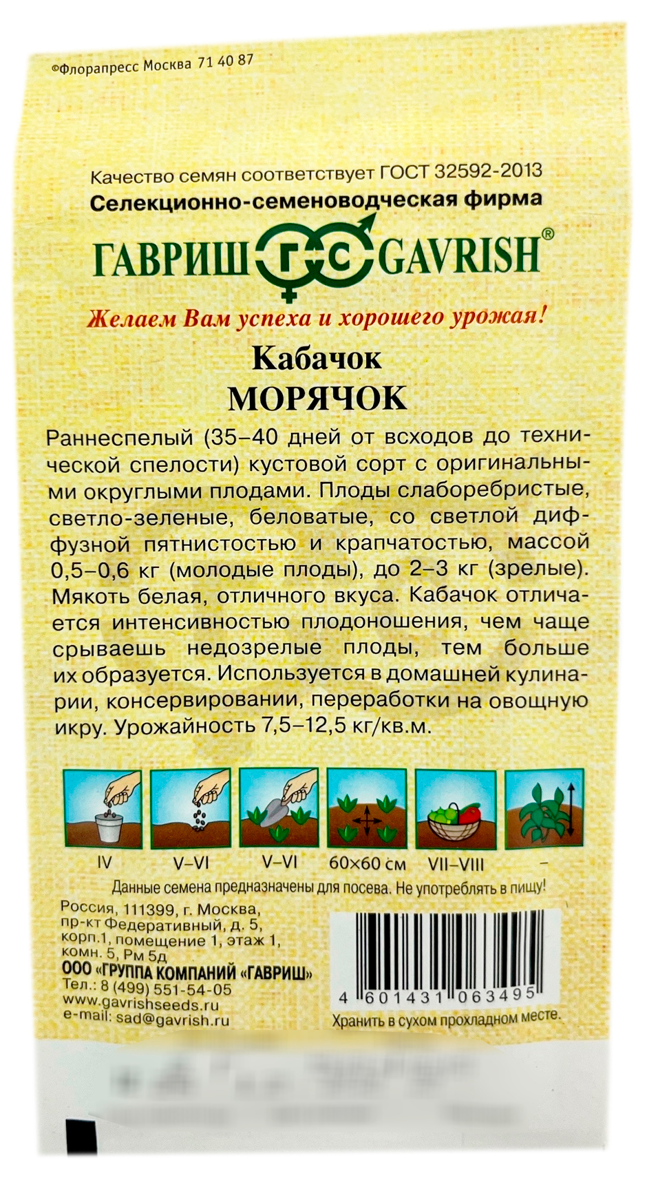 Кабачок Морячок ГАВРИШРаннеспелый (35-40 дней от всходов до технической спелости) кустовой сорт с оригинальными округлыми плодами. Плоды слаборебристые, светло-зеленые, беловатые, со светлой диффузной пятнистостью и крапчатостью, массой 0,5-0,6 кг (молодые плоды), до 2-3 кг (зрелые). Мякоть белая, отличного вкуса. Кабачок отличается интенсивностью плодоношения, чем чаще срываешь недозрелые плоды, тем больше их образуется. Используется в домашней кулинарии, консервировании, переработки на икру кабачковую.