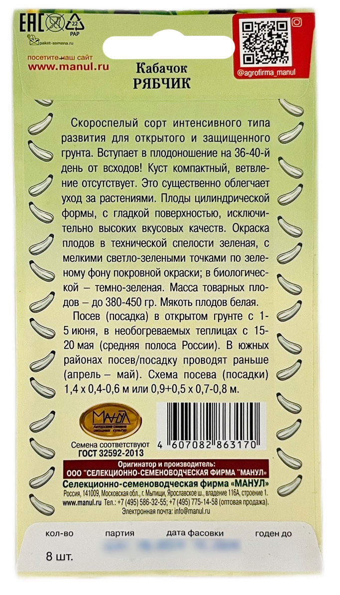 Кабачок РЯБЧИК МАНУЛКабачок Рябчик - скороспелый сорт интенсивного типа развития для открытого и защищенного грунта. Вступает в плодоношение на 36-40-й день от всходов! Куст компактный, ветвление отсутствует. Это существенно облегчает уход за растениями. Плоды цилиндрической формы, с гладкой поверхностью, исключительно высоких вкусовых качеств. Окраска плодов в технической спелости зеленая, с мелкими светло-зелеными точками по зеленому фону покровной окраски; в биологической — темно-зеленая. Масса товарных плодов — до 380-450 гр. Мякоть плодов белая.