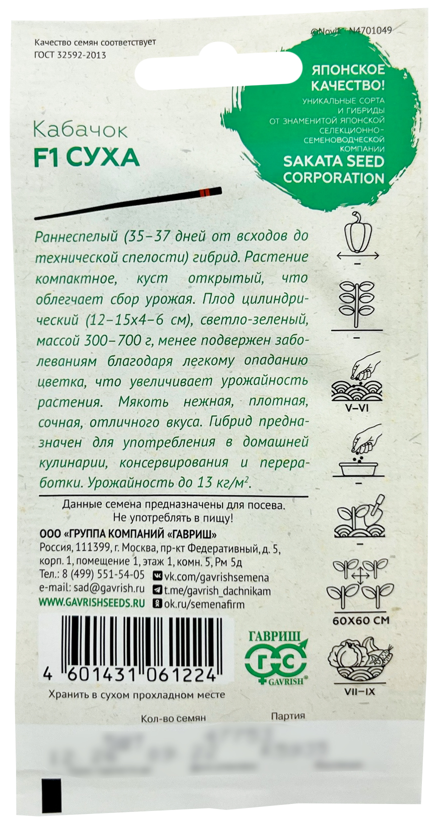 Кабачок Суха F1 ГАВРИШРаннеспелый (35-37 дней от всходов до технической спелости) гибрид для открытого грунта и теплиц. Растение прямостоячее, компактное, куст открытый, что облегчает сбор урожая. Плод цилиндрический (12-15х4-6 см), светло-зеленый, менее подвержен заболеваниям благодаря легкому опаданию цветка, что увеличивает урожайность растения. Мякоть нежная, плотная, сочная, отличного вкуса. Гибрид предназначен для употребления в домашней кулинарии, консервирования и переработки. Урожайность до 13 кг/кв.м.