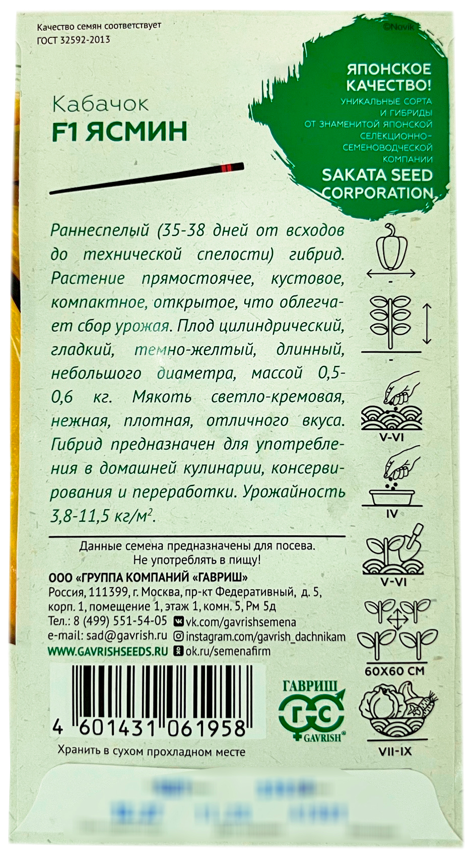 Кабачок ЯСМИН F1 ГАВРИШРаннеспелый (35-38 дней от всходов до технической спелости) гибрид для открытого грунта и пленочных теплиц. Растение прямостоячее, кустовое, компактное, куст открытый, что облегчает сбор урожая. Плод цилиндрический, гладкий, темно-желтый, длинный, небольшого диаметра, массой 0,5-0,6 кг. Мякоть светло-кремовая, нежная, плодная, отличного вкуса. Гибрид предназначен для употребления в домашней кулинарии, консервирования и переработки.
