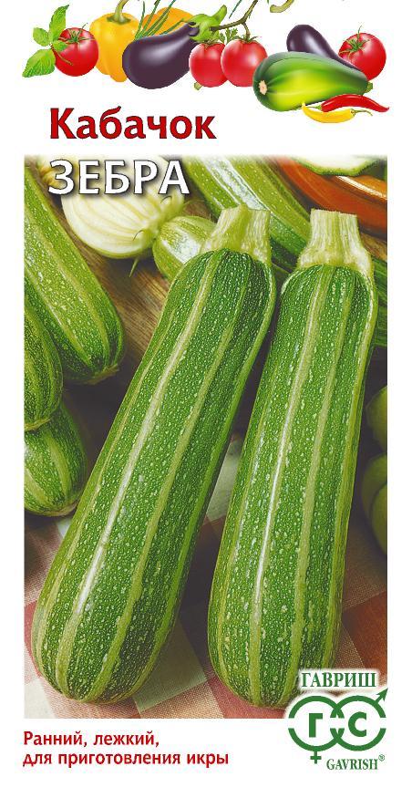 Кабачок Зебра 2 гРаннеспелый (38 дней от полных всходов до начала созревания) сорт. Растение кустовое, компактное, малоплетистое, с коротким главным побегом. Плоды цилиндрические, слаборебристые, светло-зеленые с темно-зелеными полосами, массой 0,5-0,9 кг, транспортабельные. Мякоть беловато-желтая, хрустящая, плотная, нежная, сочная. Вкусовые качества плодов отличные. Достоинства сорта: не восприимчив к мучнистой росе, вкусные, лежкие плоды, маленькая семенная камера. Товарная урожайность 9,0 кг/м2. Выращивают прямым посевом в открытый грунт в конце мая — начале июня на глубину 5-6 см по схеме 70х100 см. Плоды употребляют в вареном, тушеном и жареном виде, а также свежими (молодые завязи) в салатах. Из них получается аппетитное консервированное ассорти. Зрелые крупные плоды хранятся до 4 месяцев.