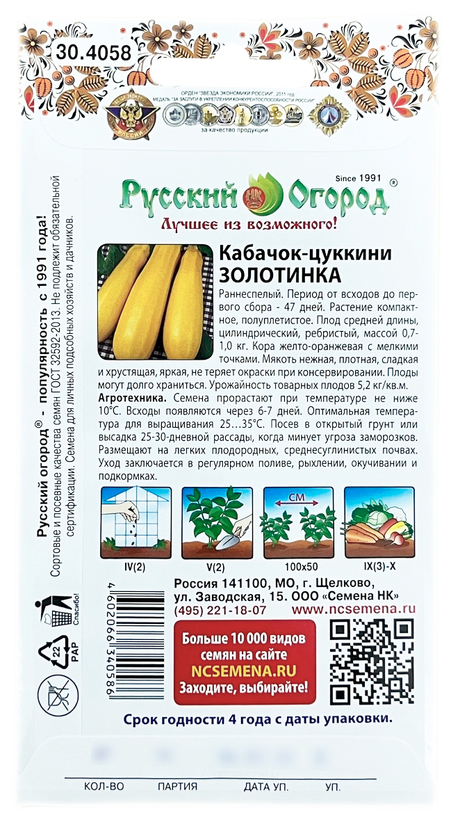 Кабачок - циккини ЗОЛОТИНКА Русский ОгородПервая из всех желтоплодных разновидностей в России – кабачок Золотинка. Золотинка имеет долгую историю выведения в нашей стране от своих итальянских «прародителей». Селекционеры станции в Херсоне поставили цель преобразовать белоплодный кабачок в насыщенно-желтую форму с небольшими плодами, которые можно было бы собирать в кратчайшие сроки. В результате, получился этот уникальный вид группы цуккини с плодоношением на 40-45 сутки.