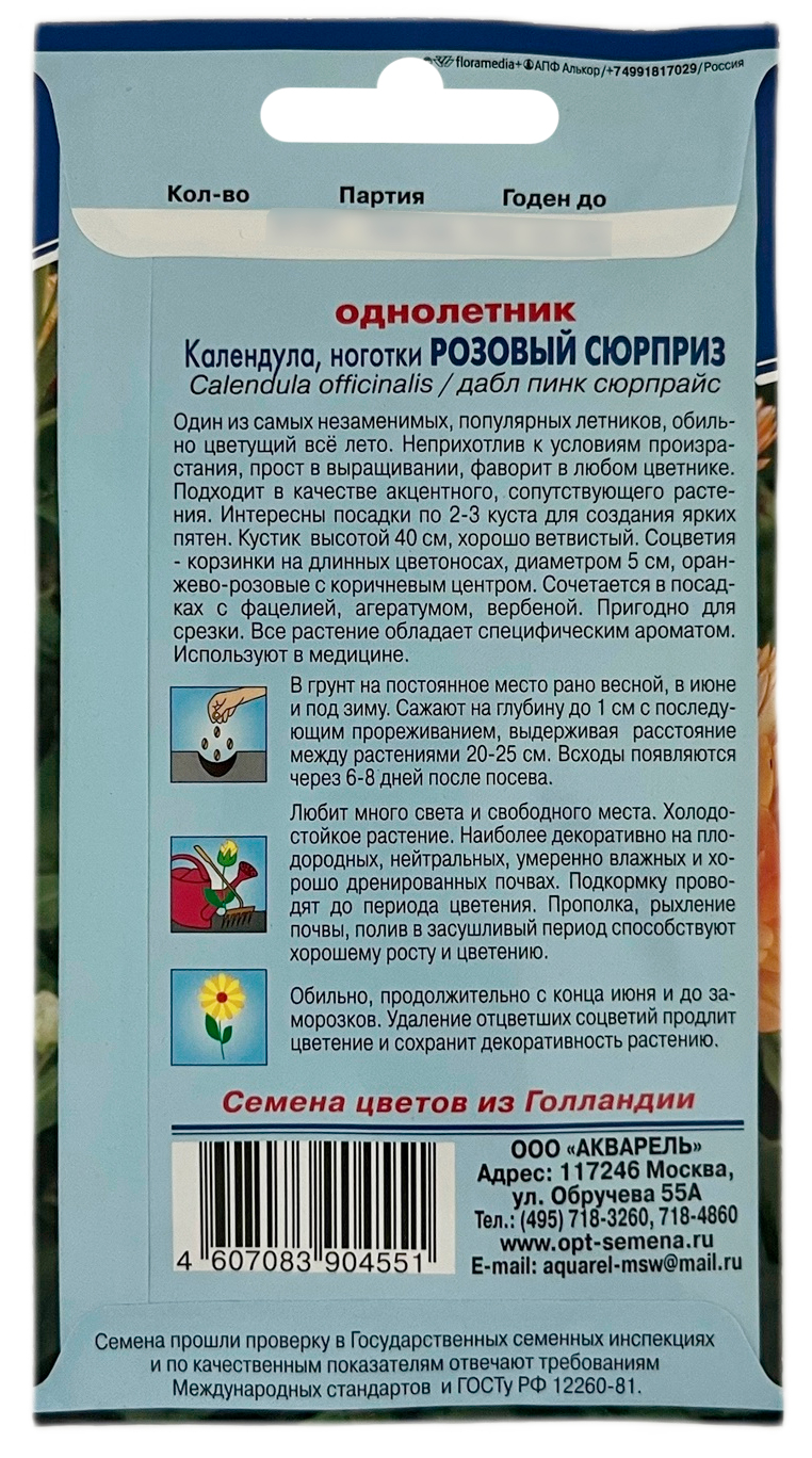 Календула ноготки РОЗОВЫЙ СЮРПРИЗ АКВАРЕЛЬОдин из самых незаменимых, популярных летников, обильно цветущий все лето. Неприхотливый к условиям произрастания, прост в выращивании, фаворит в любом цветнике. Подходит в качестве акцентного, сопутствующего растения.Интересны посадки по 2-3 куста для создания ярких пятен. Кустик высотой 40 см, хорошо ветвистый. Соцветия-корзинки, диаметром 5 см, оранжево-розовые с коричневым центром. Сочетается в посадках с фацелией, агератумом, вербеной. Пригодно для срезки.Всё растение обладает спецефическим ароматом. Используют в медицине.