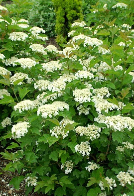 Калина обыкновенная Компактум (Viburnum opulus Compactum) - медленно растущий компактный кустарник с округлой кроной, высотой до 1,5м и диаметром до 2м. Годовой прирост 10 см. Цветет обильно в мае - июне, белыми цветками собранными в плоские зонтики - посередине двуполые, снаружи неплодоносящие. Листья светло-зеленые, с нижней стороны бледно-зеленые, опушенные, 3-5 лопастные, от 4 до 8см. Осенью листва окрашивается в оранжево-красные тона. Съедобные плоды кораллово- красные, блестящие, до 1см в диаметре, собраны в многочисленные грозди, удерживаются на растении с августа до ноября. Корневая система разветвленная стержневая.Калина светолюбива, хорошо растет на открытых местах; влаголюбива, требовательна к плодородию почвы, хорошо растет на черноземах и других видах плодородных почв. Морозостойка, не страдает от заморозков и сильных морозов. Она переносит запыленность и загазованность воздуха.