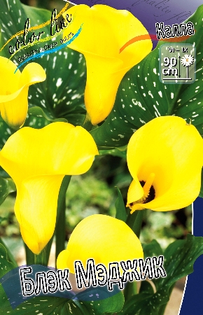 Калла Black Magic (Калла Блэк Мэджик) представляет собой травянистое многолетнее клубневое красивоцветущее растение. Высота взрослого растения достигает от 40 до 70 сантиметров в высоту. Листья зеленого цвета с белым крапом. Цветы этого растения имеют необыкновенно желтый цвет.Отлично цветет и растет только в тепле, где температура не ниже 18°C, самая оптимальная температура 22-23°C. Не переносит сквозняков. Цветоносы этого растения высокие, которые идут прямо от низа растения. Период цветения приходится на июль сентябрь. На открытом воздухе это прекрасное растение цветет 1 месяц, а в закрытом помещении 14 дней. Это влаголюбивое растение, которое требует, чтобы в поддоне всегда была вода. Предпочитает Калла Black Magic кислые, богатые гумусом почвы. Данное растение не имеет запаха. Не требует специального ухода. Возможно, выращивать в саду и дома как комнатное растение, которое будет Вас радовать своими прекрасными цветами.