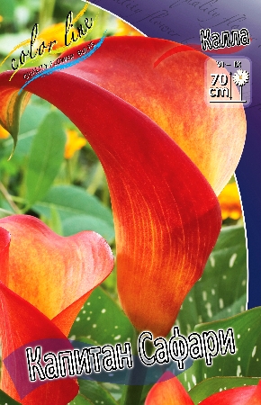 Калла Капитан Сафари относится к группе многолетних клубневых растений. Цветок желто-красный, воронкообразной формы. Высота прямых цветоносов достигает 40 см. Листья стреловидные, остроконечные или в форме сердца, темно-зеленые с белым крапом. Цветение продолжается с июля по сентябрь. Клубни каллы высаживают в апреле на глубину 15 см на расстоянии 30 см друг от друга. Предпочитают солнечное место, влажную, дренированную, богатую полезными ископаемыми и гумусом почву. Перед самыми заморозками, надземную часть растения удаляют, клубни выкапывают, оставляя 2-3 листочка на черенке, и кладут на хранение. Размножение производится делением клубня. Используется в ландшафтном дизайне, на выгонку и срезку.Характеристики